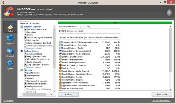 CCleaner sviluppato dalla Piriform è un ottimo programma completamente free di libero utilizzo serve per rimuovere file inutili e tutti i file temporanei comprese le tracce della navigazione in internet, dispone inoltre della comoda funzione per disinstallare i programmi.